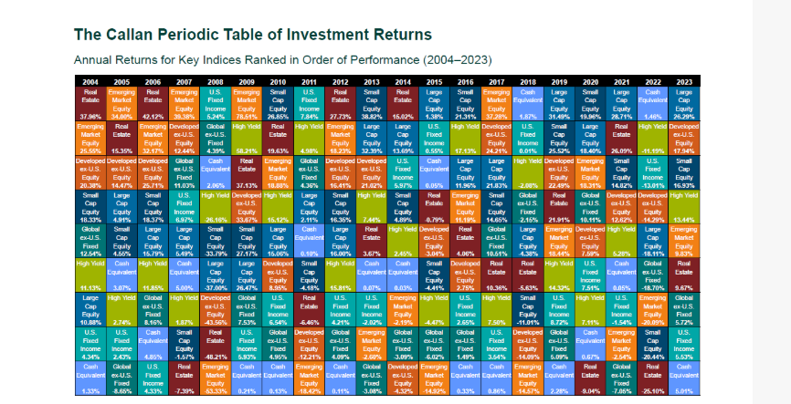 The chart below shows the Periodic Table of Returns for most asset classes over the past 20 years. You will see that what did well one year did not necessary do as well the next. You will also notice the more consistent asset classes within the chart. Diversified asset allocation strategies tend to provide the smoothest return scenario.